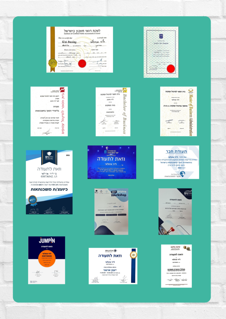 רואת חשבון, בעלת תואר ראשון במנהל עסקים וחשבונאות ותואר שני במנהל עסקים, מימון וניהול.